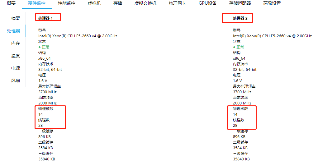 1、Workspace可以直接在前台虚拟化页面,硬件监控>处理器下查看,从下图可以计算到:可用vGPU数=2*28(注意不是2*14*28)
