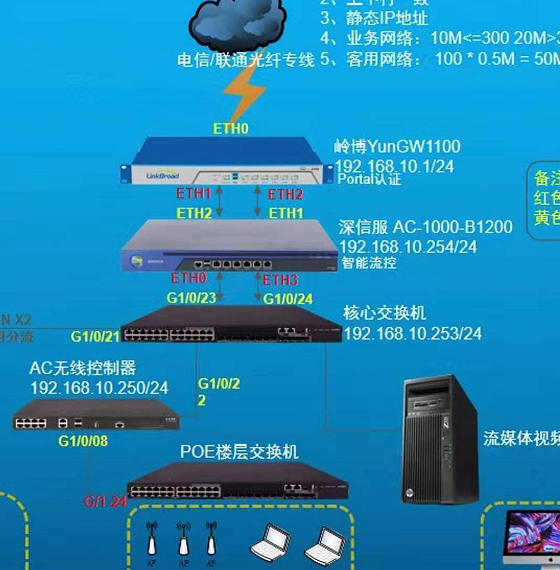 请问下,AC型号mini M30-P,AP是AI-50,AC旁挂核心,无线终端地址从出口岭博设备获取,AC只提供AP的管理地址,深信服设备是网桥模式,核心连接深信服设备配置access,核心连接AC是trunk,他们岭博说要在核心起终端的vlan,我核心起了终端的vlan,但是只是透传,现在他们岭博说看终端获取的地址都是vlan1 ,请问哪里有问题呢