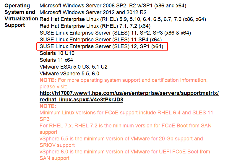 网卡型号:HPE FlexFabric 20Gb 2-port 630M Adapter, 下表为最低支持版本,支持SUSE12 SP3。