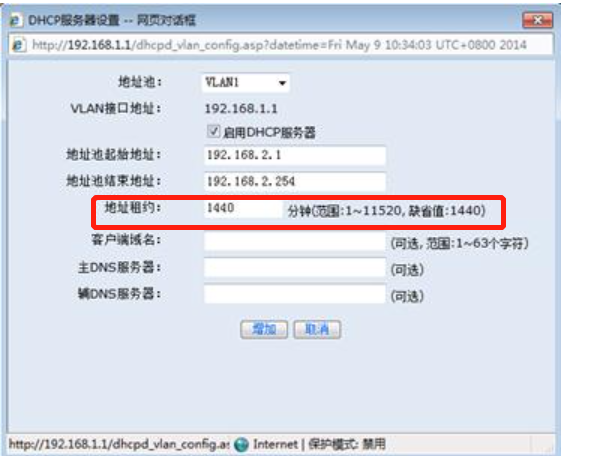 地址租约 | 设置DHCP服务器分配给客户端IP地址的租借期限。当租借期满后,DHCP服务器会收回该IP地址,客户端必须重新申请(客户端一般会自动申请) 缺省情况下,地址租约为1440分钟 |