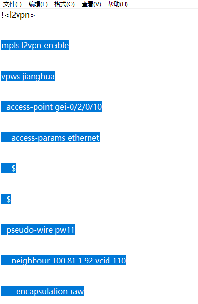 #l2vpn enable#mpls ldp#pw-class jianghua pw-type ethernet#xconnect-group pw11 connection ldp ac interface gigabitethernet 2/0/1 peer 100.81.1.92 pw-id 110#
