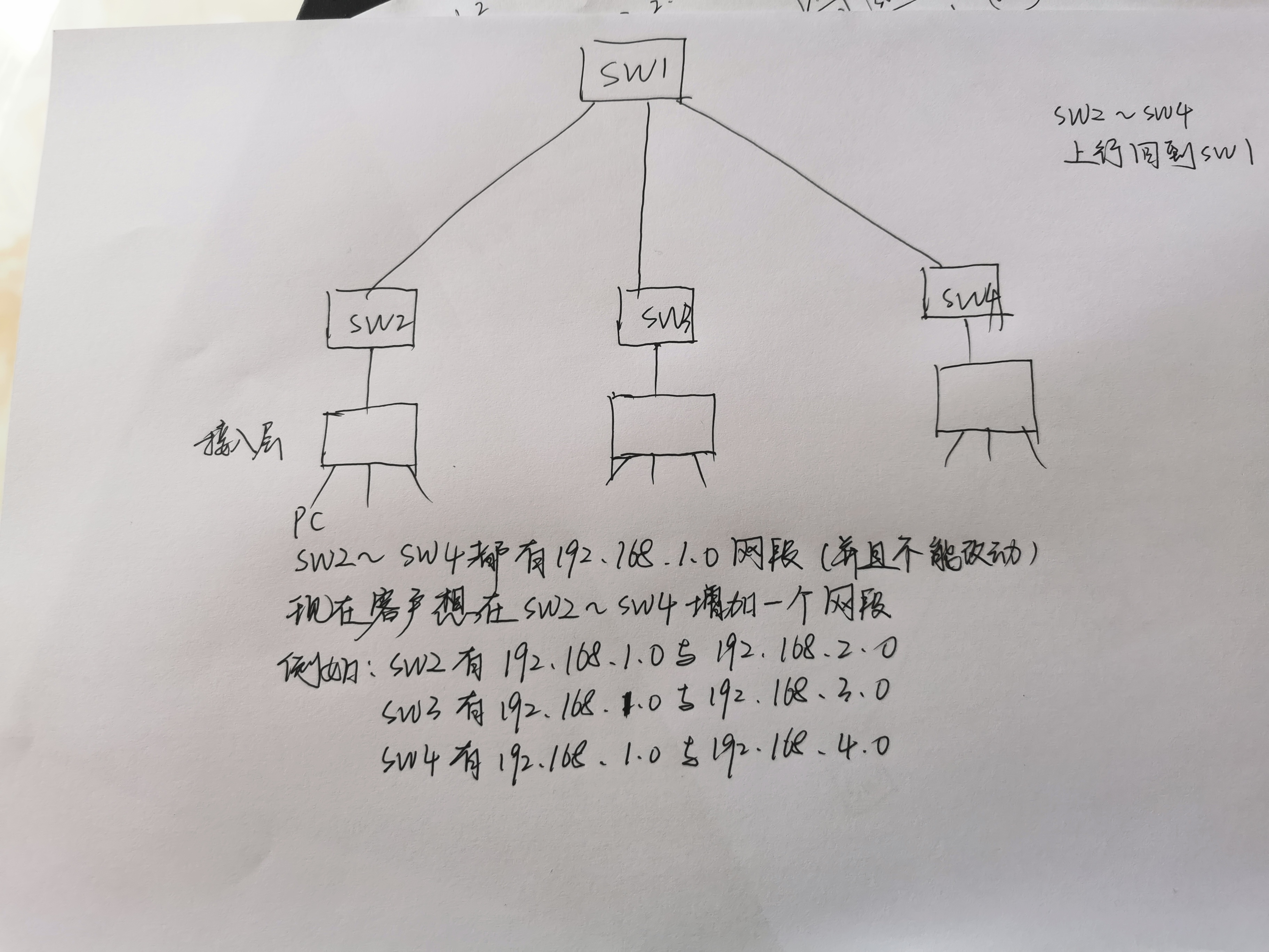 192.168.1.0段不能改,SW2-SW4都得增加一个网段