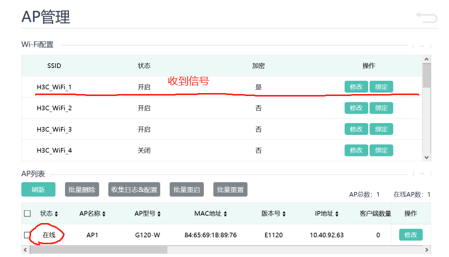 G120-W修改成AP模式后,下挂在G120-w(AC模式)下,目前AC已经能管理AP,但是收不到AP的信号,需要怎么处理,谢谢!