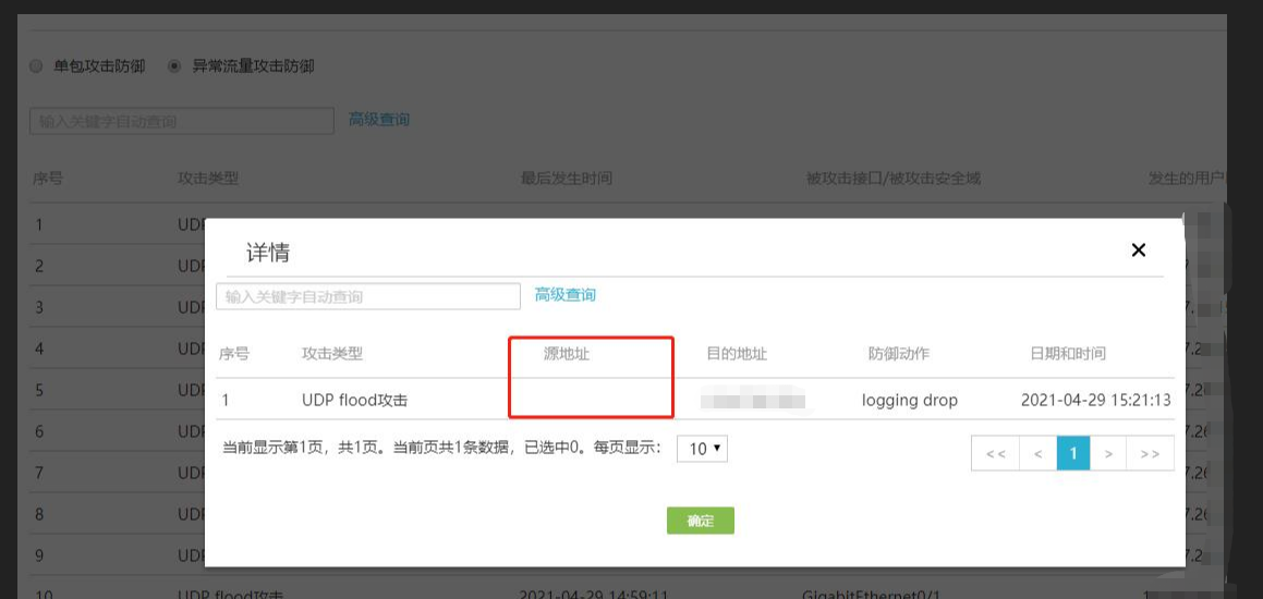 问题一:异常流量攻击防御详情里面没有源ip,如图