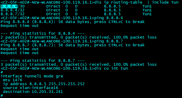 <CZ-05F-A02#-NEW-WLANCORE-100.119.16.1>dis ip routing-table 8.8.8.5 Summary count : 3 Destination/Mask Proto Pre Cost NextHop Interface 0.0.0.0/0 Static 60 0 100.119.14.254 Vlan100 8.8.8.4/30 Direct 0 0 8.8.8.5 Tun1 8.8.8.5/32 Direct 0 0 127.0.0.1 InLoop0 <CZ-05F-A02#-NEW-WLANCORE-100.119.16.1>dis cu int tun # interface Tunnel1 mode gre mtu 1476 ip address 8.8.8.5 255.255.255.252 source Vlan-interface16 destination 10.205.33.241 # return 我本端是5对端是4啊