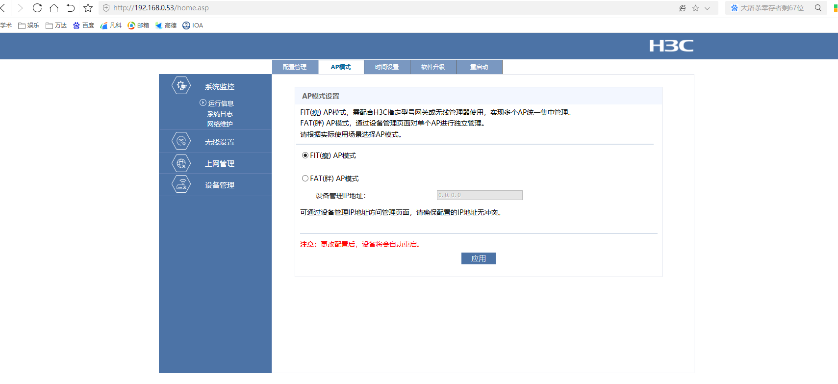 打印机接在MER3220上,笔记本链接挂在MER3220的ap51上散出来的无线,之前一直能正常打印,从昨天开始无线的不能正常打印了,检查发现无线设备ping mer3220网关 192.168.0.1 不通,无线设备现在的网关为192.168.1.1   ap模式为瘦AP