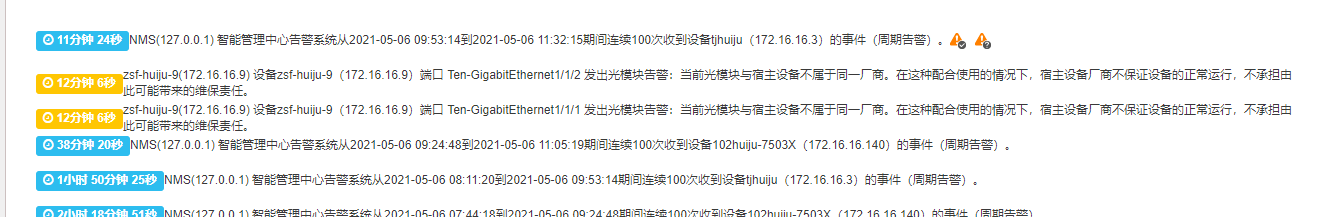 NMS(127.0.0.1) 智能管理中心告警系统从2021-05-06 09:53:14到2021-05-06 11:32:15期间连续100次收到设备tjhuiju(172.16.16.3)的事件(周期告警)。