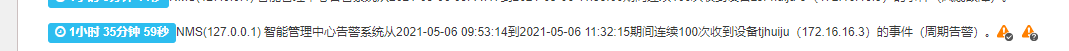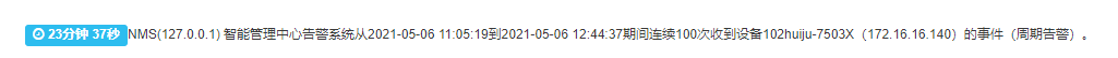详细信息 智能管理中心告警系统从2021-05-06 11:05:19到2021-05-06 12:44:37期间连续100次收到设备102huiju-7503X(172.16.16.140)的事件(周期告警)。 告警原因 智能管理中心的告警系统发现故障源重复发送此事件。 修复建议 请查看故障源重复发送此事件的原因。 设备上的日志只有这个 %May 6 11:49:52:518 2021 102huiju-7503X IFNET/3/PHY_UPDOWN: Physical state on the interface GigabitEthernet2/2/0/29 changed to down. %May 6 11:49:52:536 2021 102huiju-7503X IFNET/5/LINK_UPDOWN: Line protocol state on the interface GigabitEthernet2/2/0/29 changed to down. %May 6 12:32:38:996 2021 102huiju-7503X IFNET/3/PHY_UPDOWN: Physical state on the interface GigabitEthernet2/2/0/29 changed to up. %May 6 12:32:38:999 2021 102huiju-7503X IFNET/5/LINK_UPDOWN: Line protocol state on the interface GigabitEthernet2/2/0/29 changed to up.