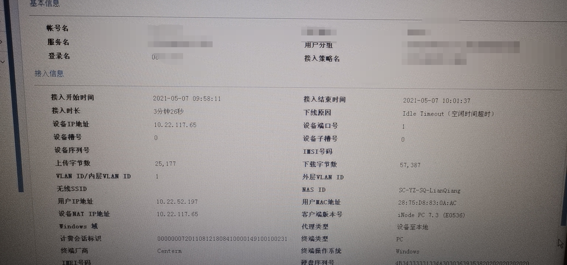 请教大神们,客户现场有一个使用inode客户端进行portal接入的用户出现使用过程中频繁掉线的问题,接入时长不定。接入明细记录下线原因为“Idle timeout”。接入设备上也没有配置idle-cut等配置。会造成记录"Idle timeout"的原因还能有啥?