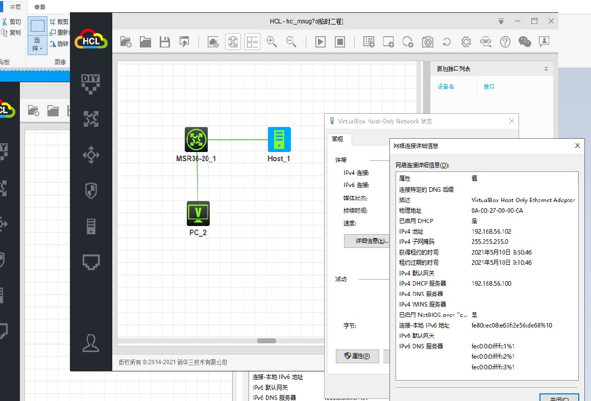 其次也有可能是virtual-box自动生成的IP段。我这边也安装有HCL模拟器,看了下虚拟网卡的地址段也是192.168.56.0/24的IP地址。