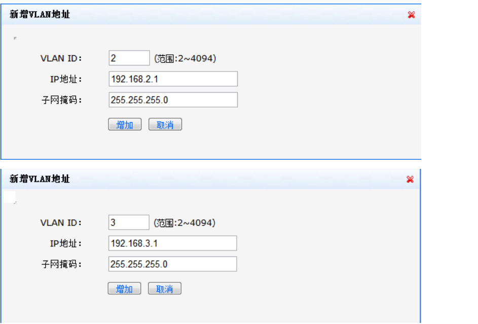 单击“新增”按钮,输入vlan id即vlan的编号(2~4094任意一个数字)、IP地址即本网段的网关、子网掩码,填写完成后单击“增加”按钮确认。。