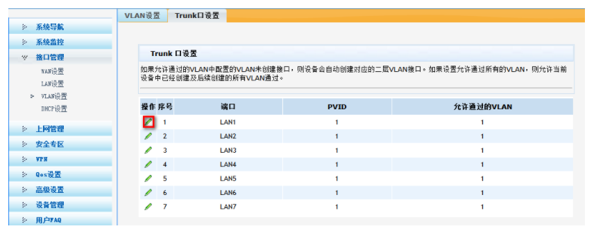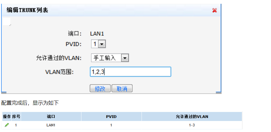 单击LAN1口左侧的编辑按钮或者双击这一行进行修改,该接口的pvid仍为1,允许通过的vlan设置为1,2,3或者所有vlan,单击“修改”按钮确认trunk口的修改。