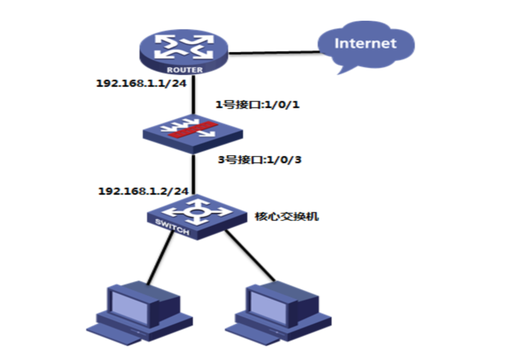 如下组网图所示,在原有的网络中增加防火墙来提高网络安全性,但又不想对原有网络配置进行改动,所以需要防火墙采用透明模式部署;其中GigabitEthernet 1/0/1接口接原有路由器的下联口,GigabitEthernet 1/0/3接口接原有的交换机上联口。