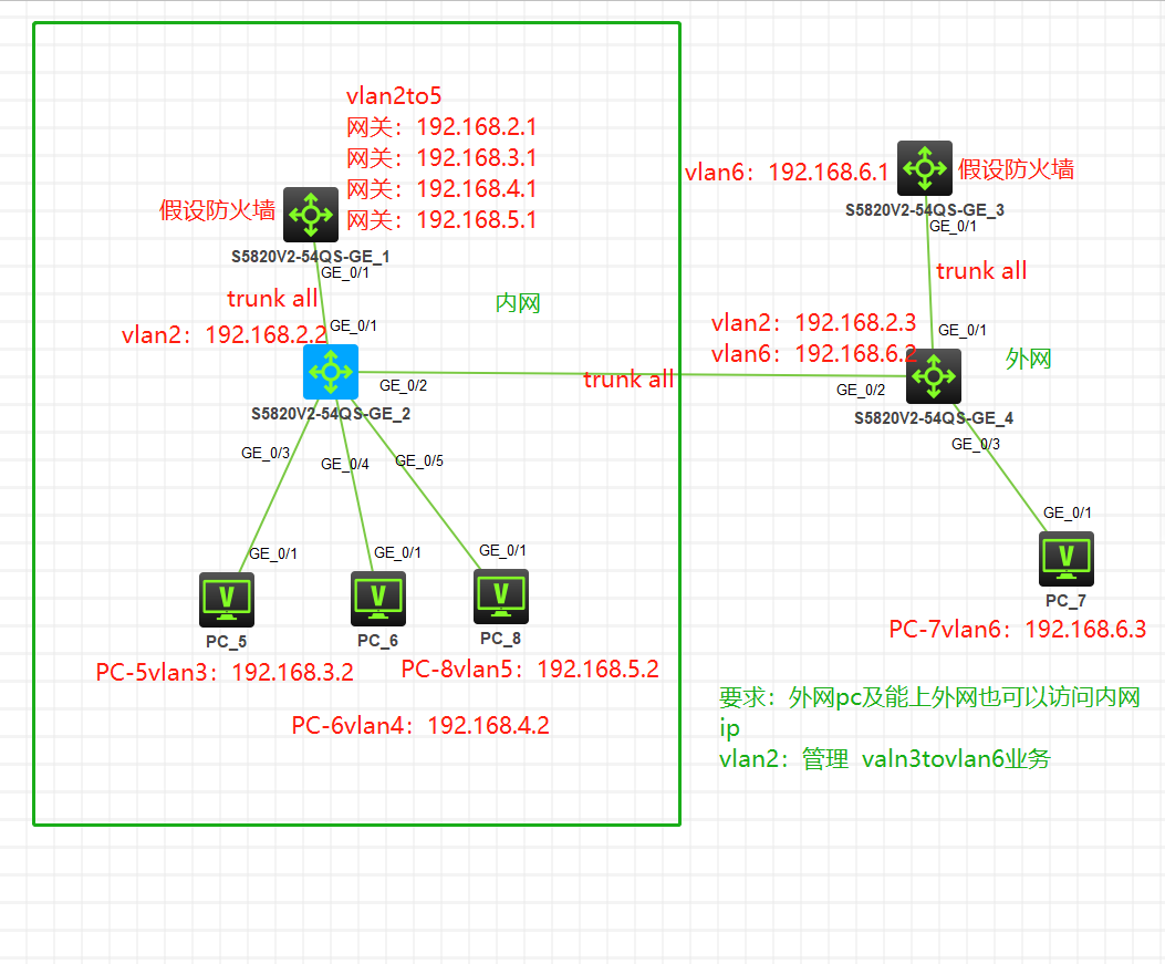 3-5网段网关在左边假设的防火墙上 6网段的网关在右边假设的防火墙上 你瞅瞅 合理不