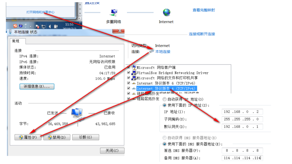 #设备默认的管理地址为192.168.0.100/24,并默认开启DHCP功能。可以将电脑直连设备LAN口获取地址,然后登录设备WEB管理页面。也可以手动给电脑配置地址,方法参考如下:将电脑设置为192.168.0.2/24地址后连接设备LAN口登录设备。IP地址配置方法:点击右下角电脑图标 >选择“打开网络和共享中心”。