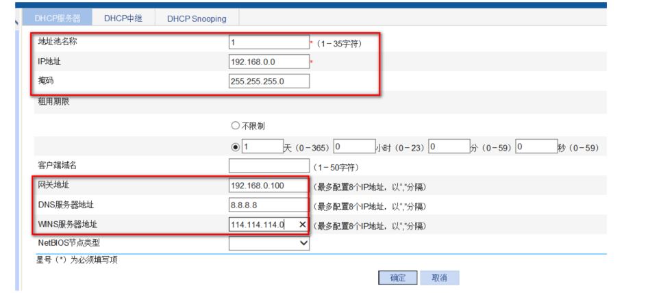 #地址池名称选择“1”,并填写要分配的地址段、掩码、网关及DNS服务器地址。