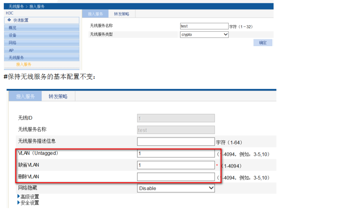 #选择“无线服务”>“接入服务”>“新建”。“服务名称”为test,“服务类型”为crypto。