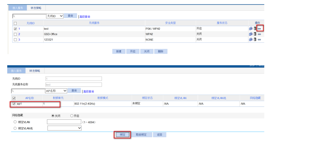 #绑定无线服务到AP射频接口(如若是双射频AP,则两个射频口都选中、绑定)。