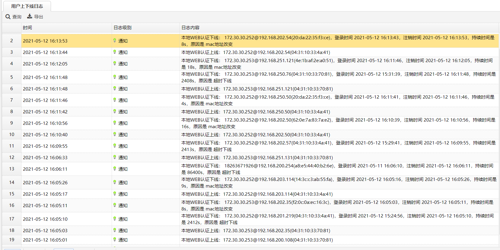 可以看着第二条日志上线对应的MAC与第一条日志对应的MAC不一样,所以还是怀疑现场有不同的终端使用同一个IP地址,如果存在这种情况,推荐使用静态MAC绑定