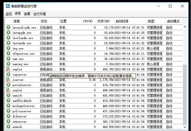 imc启动发现报错,有三个进程无法启动,重启服务及重启服务器均无法解决问题,报错信息及日志如下: