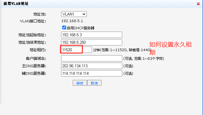 设置DHCP地址租期,可填的最大值为11520,如何设置为永久租期(无限租期