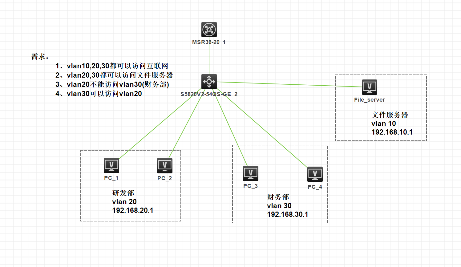 2、VLAN 30不能访问VLAN 20,VLAN 20能访问VLAN 30,这种属于单通的需求,建议使用防火墙等安全设备来实现。