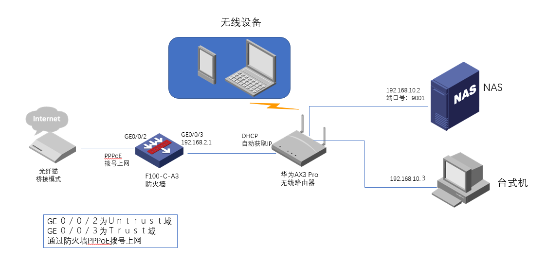 注:华为AX3pro不需要做任何变动,包括不需要关闭uPnP和内置防火墙等,原来什么样子就什么样子。从AX3pro的Wlan口192.168.2.2到内网192.168.10.2的nat仍由AX3pro承担。