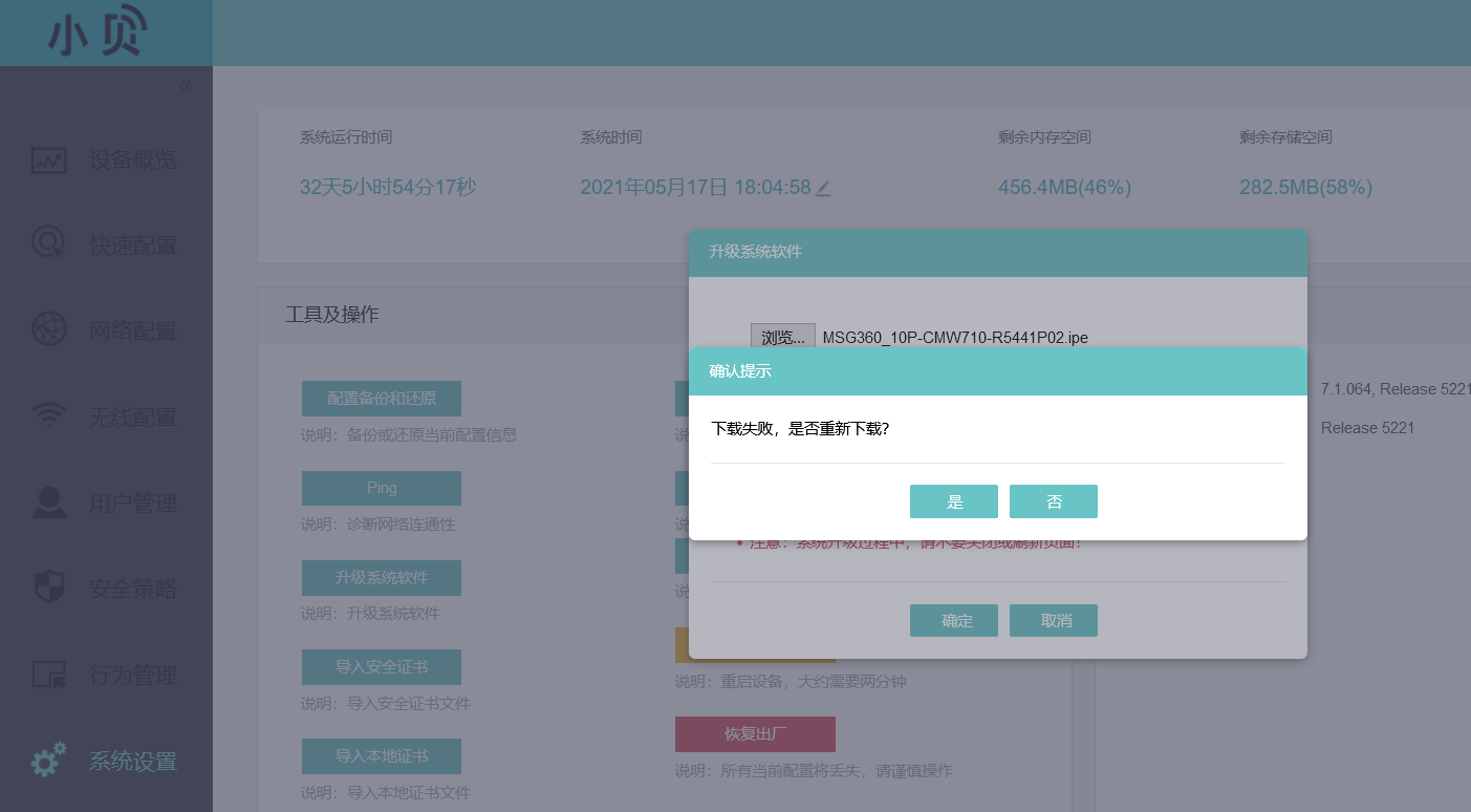 小贝版本 5221 上传最新的升级文件5441 ipe 文件 提示如图 剩余空间是280 多M 是因为剩余空间不足吗
