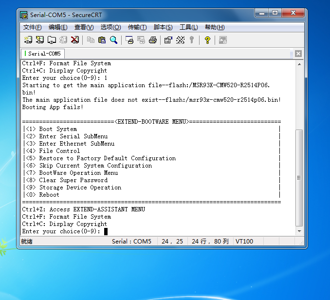 我这里有一款MSR-930路由器,PC通过Console线接设备,会发现设备一开机就进入Bootrom菜单(图一),无法进入命令行界面。之前是通过CRT终端-发送XModem功能,发送过MSR93X-CMW520-R2314.bin的脚本,但是通过图二启动文件中却找不到我传过去的脚本。