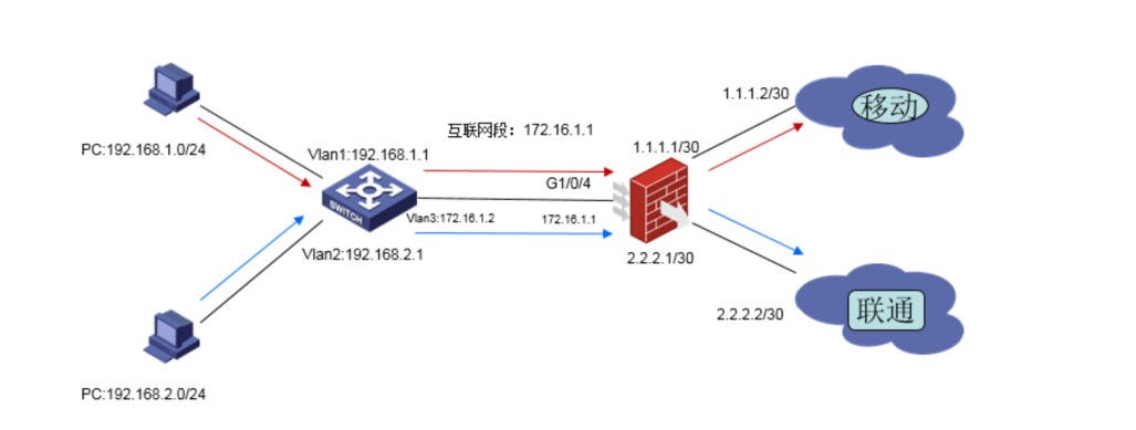 防火墙作为网络出口设备,外网有移动和联通两条线路。内网有192.168.1.0和192.168.2.0两个网段,需要实现192.168.1.0网段走移动线路,192.168.2.0网段走联通线路。当两条线路中的一条线路故障时数据可以通过正常链路转发。