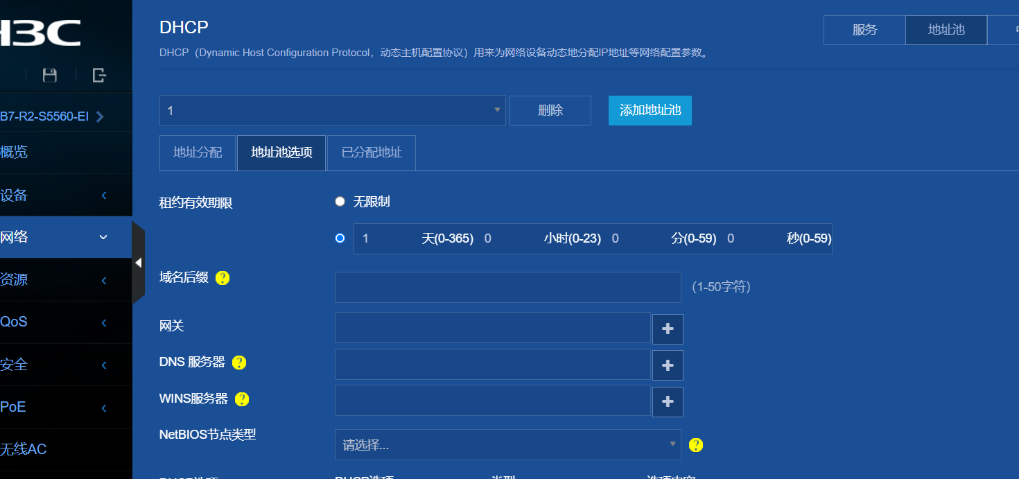 可以在导航栏:网络>服务>DHCP里面的dhcp选项里修改相关配置,改完后再界面左上角有保存