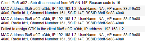 wac361下发ip,9台wap712c无线ap下接入终端200个左右,早上9点到9点半接入时出现大量Reason code is 16,需要多次连接无线才能连上,有时会出现连不上的情况