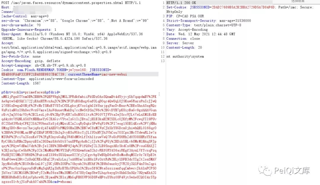 POST /imc/javax.faces.resource/dynamiccontent.properties.xhtml HTTP/1.1Host: Connection: closeCache-Control: max-age=0sec-ch-ua: "Chromium";v="88", "Google Chrome";v="88", ";Not A Brand";v="99"sec-ch-ua-mobile: ?0Upgrade-Insecure-Requests: 1User-Agent: Mozilla/5.0 (Windows NT 10.0; Win64; x64) AppleWebKit/537.36 (KHTML, like Gecko) Chrome/88.0.4324.190 Safari/537.36Accept: text/html,application/xhtml+xml,application/xml;q=0.9,image/avif,image/webp,image/apng,*/*;q=0.8,application/signed-exchange;v=b3;q=0.9Sec-Fetch-Site: noneAccept-Encoding: gzip, deflateAccept-Language: zh-CN,zh-TW;q=0.9,zh;q=0.8COOKIE: oam.Flash.RENDERMAP.TOKEN=jw7ysel68; JSESSIOnID=EB4E60FA4F333FF21B488E9937B4C739; currentThemeName=imc-new-webuiContent-Type: application/x-www-form-urlencodedContent-Length: 1564