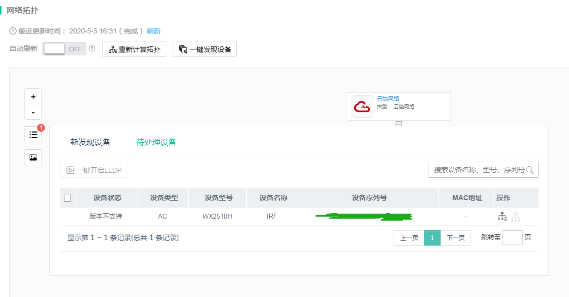 另外,看你的设备名称是IRF,现网实际是不是IRF呢?如果是,在绿洲上添加设备时需要勾选IRF选项,全部IRF成员设备需要添加至同一分组,且该分组仅包含该IRF成员设备。(注:先添加IRF主设备,再添加备设备。