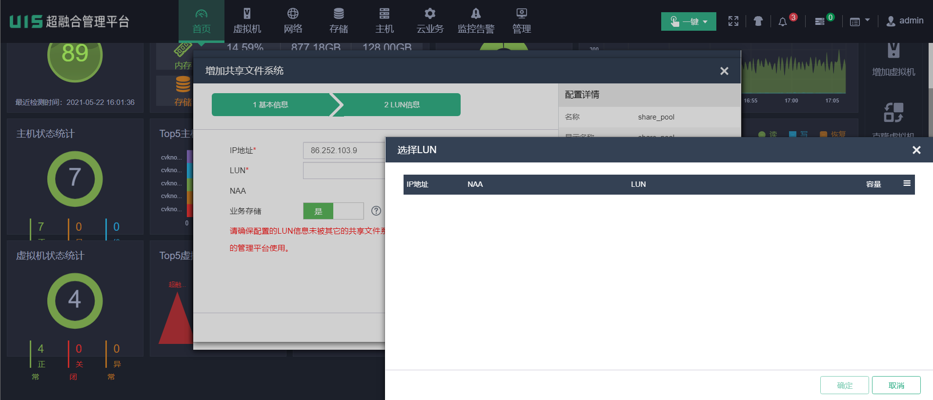 增加共享存储时,没有LUN信息,是那里漏配了吗。