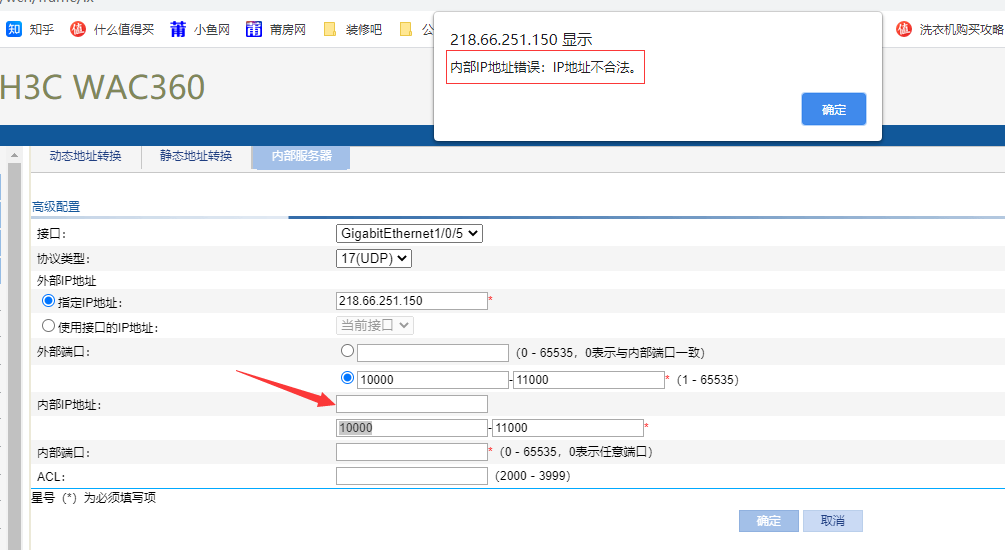 WAC360无线路由器,现在需要把UDP10000-11000端口映射到外网,遇到了问题。如果选择外部端口范围填写端口后,内部IP地址这里就无法填写任何信息,到保存的时候又提示内部IP地址错误。请问是我操作的不对还是系统有问题???