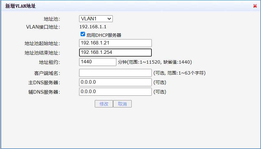 地址池结束地址 | DHCP服务器地址池的结束地址,且地址池结束地址要大于起始地址 |