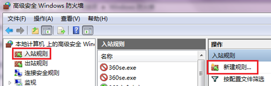 打开“控制面板”,单击“防火墙”,然后单击“高级设置”。进入新建规则设置界面。