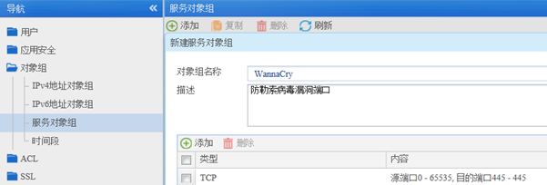 在“对象组”中选择“服务对象组”添加名称为“WannaCry”的对象组并编辑445端口的对象。