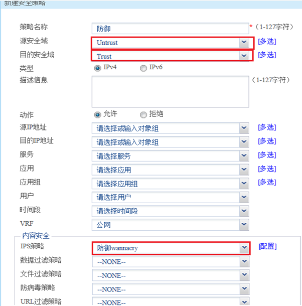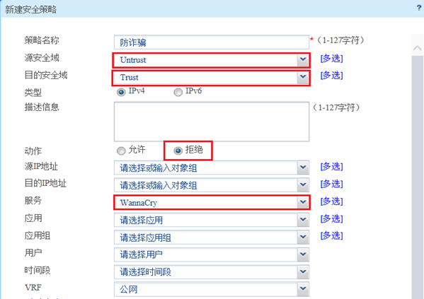 在安全策略中选择“新建”源安全域现则“untrust”目的区域为“trust”区域并调用“防御Wannacry”策略。
