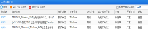 2、通过IPS策略检测利用MS17-010相关漏洞的病毒并重置。