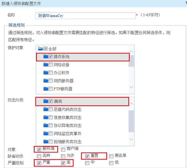 在“应用安全”中点击“入侵防御”》“配置文件”点击新建。新建“防御Wannacry”筛选对象为“操作系统”筛选攻击分类为“漏洞”。对象为“服务端”,缺省动作为重置,级别为“严重”和“高”。