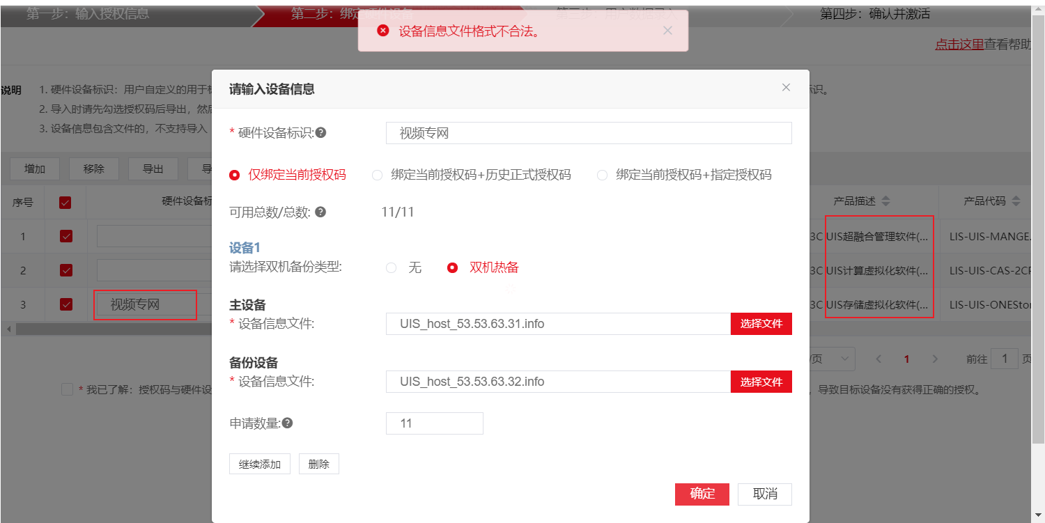 超融合平台授权 ,添加计算虚拟化软件和超融合管理软件,一直提示设备信息文件不合法,按照授权文档操作,浏览器换了也不行,超融合管理软件和计算虚拟化软件授权不是用主备设备的信息吗