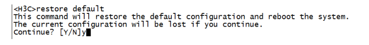 <H3C>提示进入设备命令行,命令行下输入:restore default命令并回车,再次输入Y确认后,路由器将恢复到出厂设置并重新启动,同时账号密码也恢复到初始配置,初始账号密码均为小写的admin。