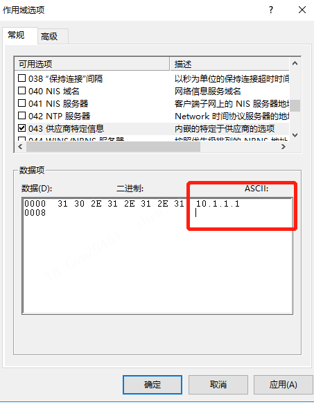 option 43 hex 8007000001c0a80a64