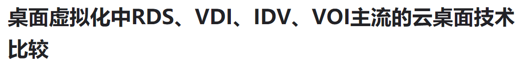 idv和服务器断开后可以继续使用, idv属于胖终端,数据处理在本地,用户权限更大。 vdi属于瘦终端,数据处理在服务器上,和服务器断开,桌面断开,数据更安全。相对应用后权限更小 voi暂时还没有搞过不清楚。