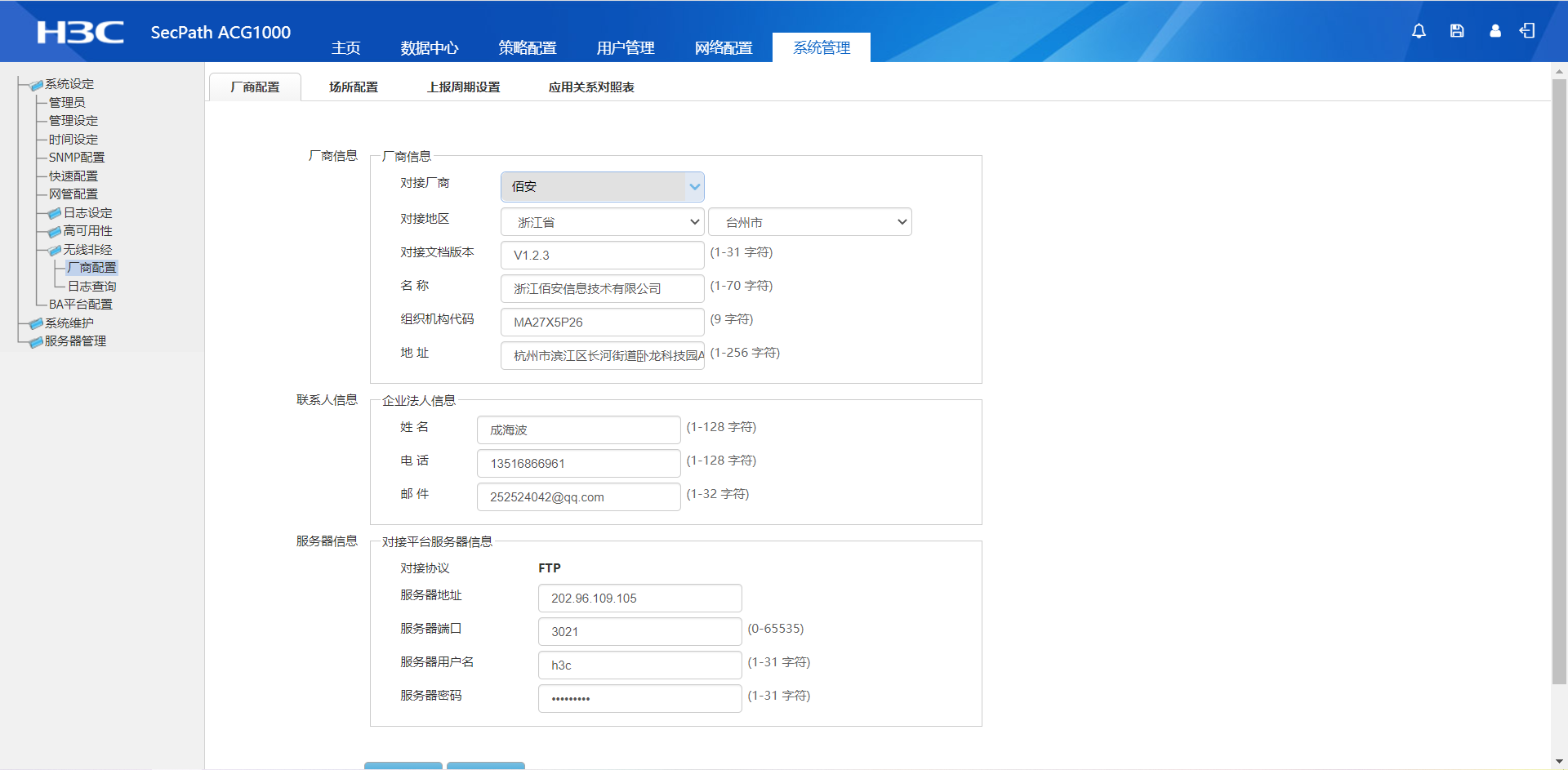 在导航栏中选择“系统管理>无线非经>厂商配置”,进入厂商配置页面,在该页面上可以选择相关对接厂商配置相关数据,如图1-1所示;厂商配置页面展示详细说明如表1-1所示。