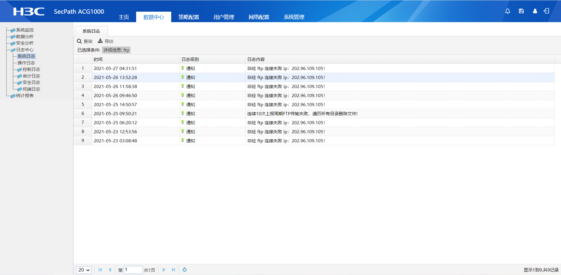 acg1000做了短信认证,然后做无线非经的配置,对接公安的佰安平台。现在配置都完成了,但是系统一直报错提示非经ftp连接失败,用客户的内网环境去ftp对端平台ftp都是正常的,acg1000的非经ftp一直访问失败。acg在核心和出口路由器中间做透明桥。