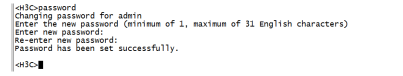 使用Consosle口登陆设备,参考【01设备管理】章节中的【1.1.1 Console方式登录设备方法】<H3C>提示进入设备命令行,输入password命令并回车,按照系统提示,提示:enter new password(输入新密码),则可以直接输入新密码,并重新输入一次确认即可。