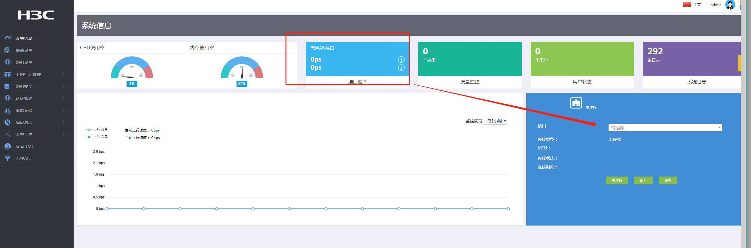 今天登录MSR3660设备WEB界面想查看进出(WAN/LAN)端口下的流量数据,点击之后却显示无WAN接口,请教下各位大神是什么情况呢?之前配置都是在命令字符行里配置的。